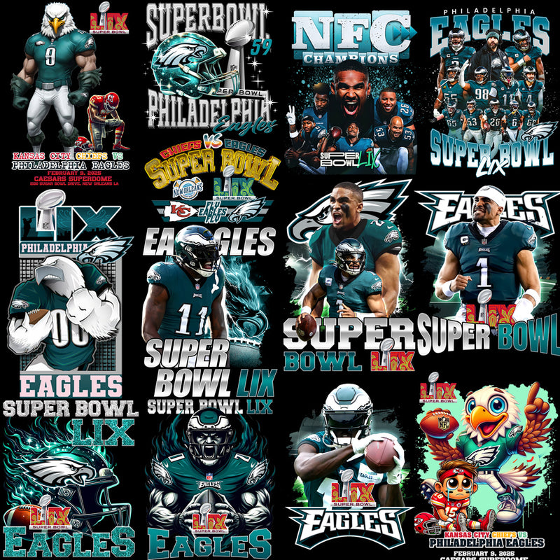 Kick off the celebration of the Philadelphia Eagles' victory in Super Bowl 2025 LIX with our exclusive bundle of 26 high-quality PNG designs! This collection features unique, eye-catching graphics celebrating the Eagles as champions of the football world. Perfect for your DTG (Direct-to-Garment) or DTF (Direct-to-Film) print shop, these designs are tailored to make your t-shirt business soar to new heights.
