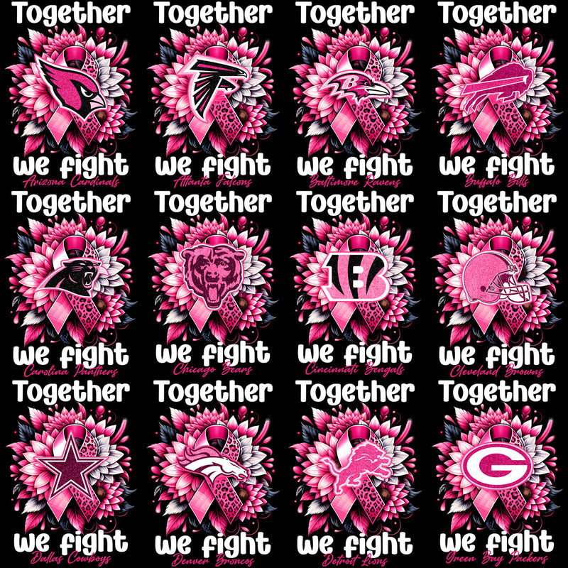 Introducing the "32 Breast Cancer Awareness Football Teams Designs Bundle"! This unique collection features high-quality PNG designs representing all 32 NFL teams, each infused with the spirit of breast cancer awareness. Perfect for your DTG (Direct-to-Garment) or DTF (Direct-to-Film) print shop, these eye-catching designs give you everything you need to create stunning t-shirts that support a significant cause.