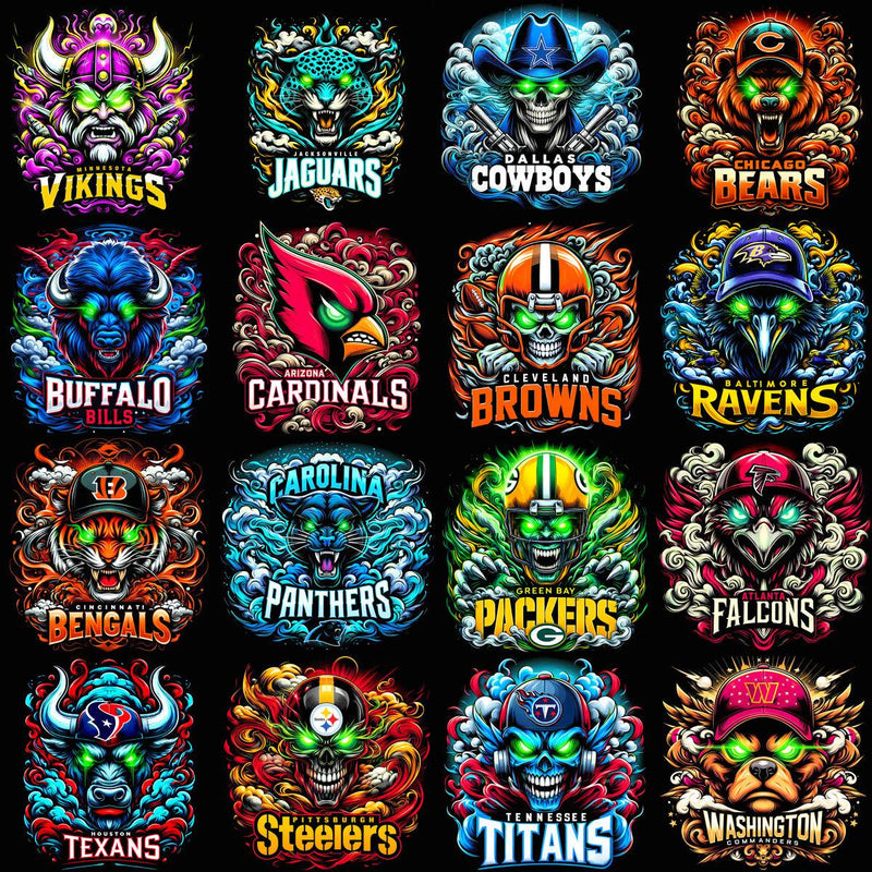 - 32 unique football team designs featuring laser-eyed mascots
