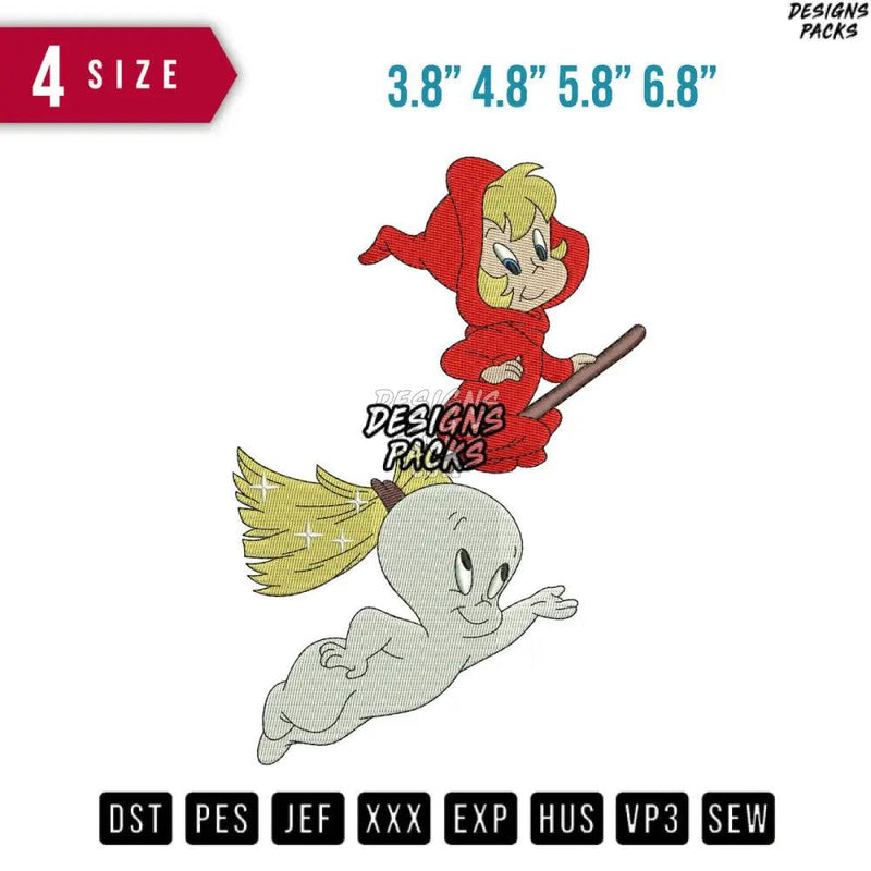 Delightful Halloween embroidery design featuring Casper the friendly ghost and his adorable companion Wendy. Perfect for adding a spooky yet charming touch to your Halloween decorations, clothing, or gifts. This digital download includes multiple sizes for embroidery machines.