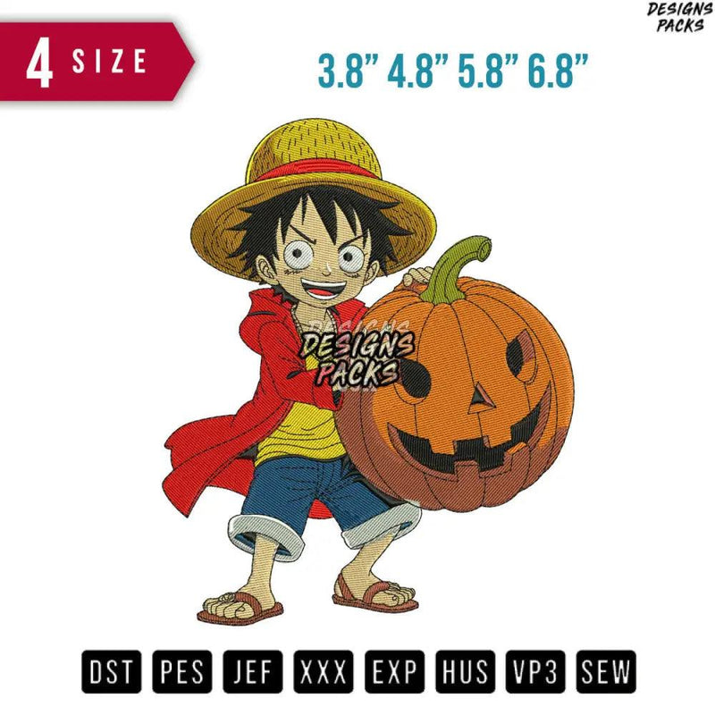 Celebrate Halloween with Luffy's infectious energy! This digital embroidery design features the iconic anime pirate captain sporting a mischievous pumpkin grin. Download and stitch a festive and unique decoration for your home or apparel. Perfect for fans of One Piece and Halloween enthusiasts alike!