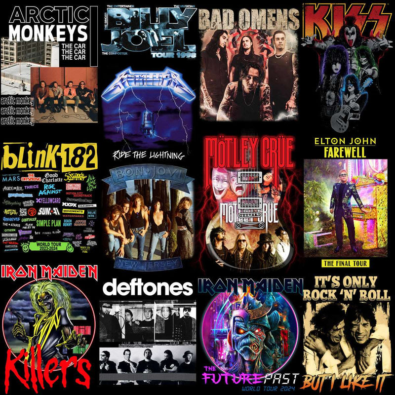 Bands & artists featured: Metallica, Guns N' Roses, Rammstein, Oasis, Red Hot Chili Peppers, Bon Jovi, Blink-182, Avenged Sevenfold, Linkin Park, Fleetwood Mac, Rolling Stones, Iron Maiden, Judas Priest, Slayer, Pantera, Arctic Monkeys, Radiohead, Alice in Chains, Deftones, Tool, Green Day, Maneskin, Bad Omens, Motley Crue, Billy Joel, Elton John, Queen, Alice Cooper, Ozzy Osbourne, Five Finger Death Punch, The Who, Foo Fighters, and many more
