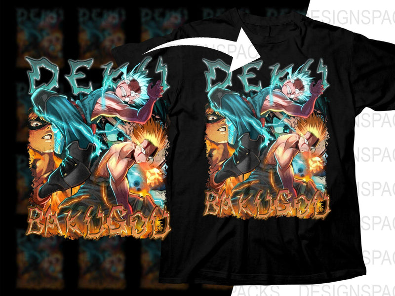 Get your hands on this high-energy anime-inspired T-shirt featuring dynamic illustrations of Deku and Bakugo, perfect for fans and casual wearers alike!