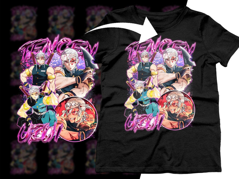 Stand out with this vibrant Tengen Uzui design T-shirt featuring dynamic anime-inspired graphics and bold colors perfect for any fan.