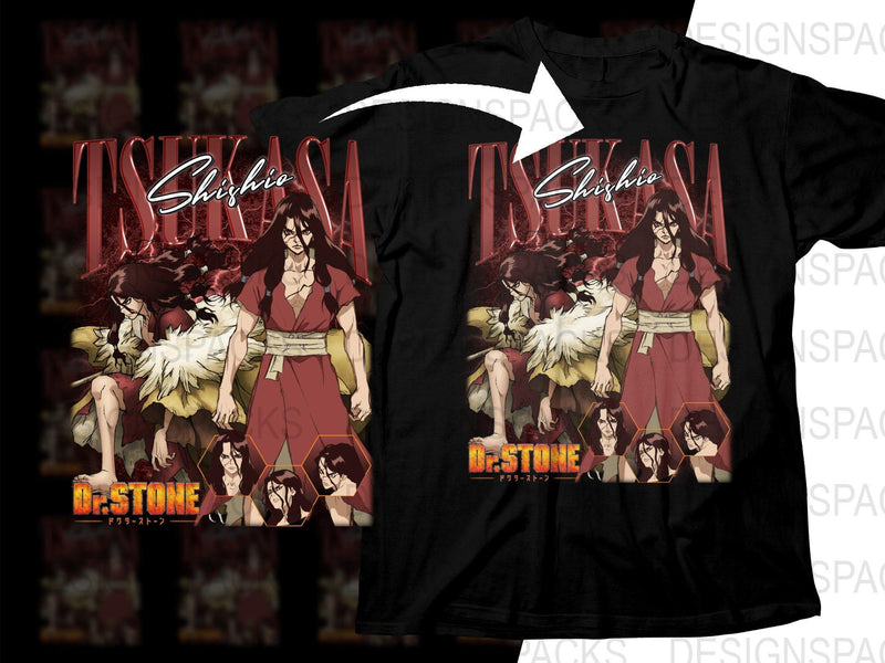 Show your love for Dr. Stone with this Tsukasa Shishio T-Shirt! Featuring dynamic artwork of Tsukasa in various poses, it's a must-have for anime fans.