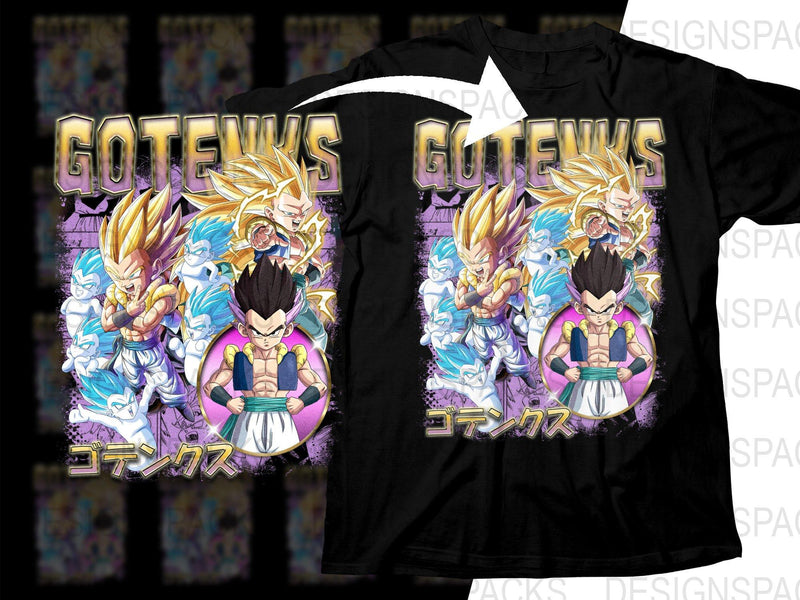 Discover our vibrant Gotenks T-Shirt, featuring dynamic graphics and Japanese text. Perfect for fans, it brings anime action to your wardrobe in bold, striking colors.