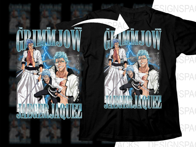 Show off your style with our Grimmjow Jaegerjaquez T-shirt. Features bold anime graphics on a comfortable, high-quality tee perfect for any fan.