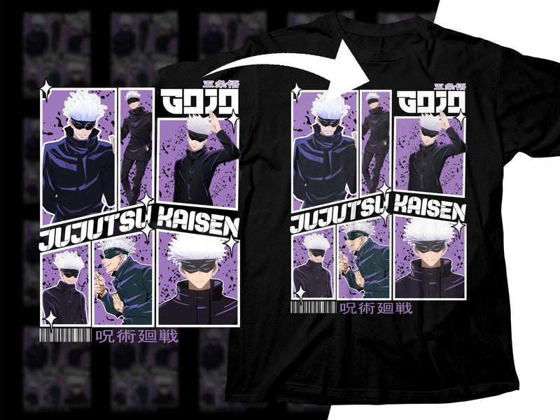 Show off your love for Jujutsu Kaisen with this Gojo Satoru collage purple design T-shirt. A must-have for anime fans featuring vibrant character art.