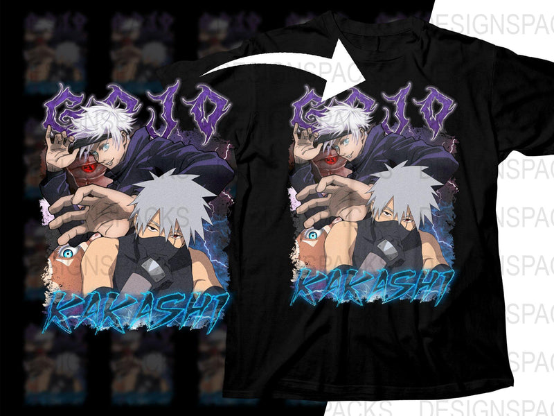 Dive into anime action with this bold T-Shirt featuring stylized designs of iconic characters Kakashi and Gojo in vibrant, electrifying colors.