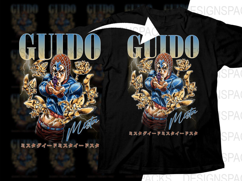 Show your fandom with this eye-catching Guido Mista T-shirt featuring vibrant artwork and striking colors. Perfect for every JoJo's Bizarre Adventure fan!