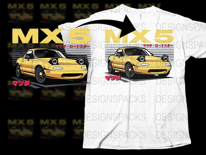 Stand out with this eye-catching t-shirt featuring a detailed graphic of the iconic MX-5 roadster in bright yellow against a stylish backdrop.