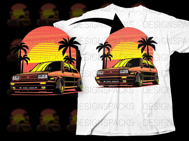 Experience retro vibes with this stylish Png Digital Download featuring a classic car against a vibrant sunset and palm trees backdrop. Stand out in vintage flair.