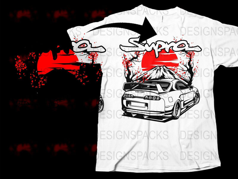 Embrace the art of urban style with this unique Supra Mountain and Cherry Blossom Png Digital Download featuring a stunning car and scenic backdrop graphic.
