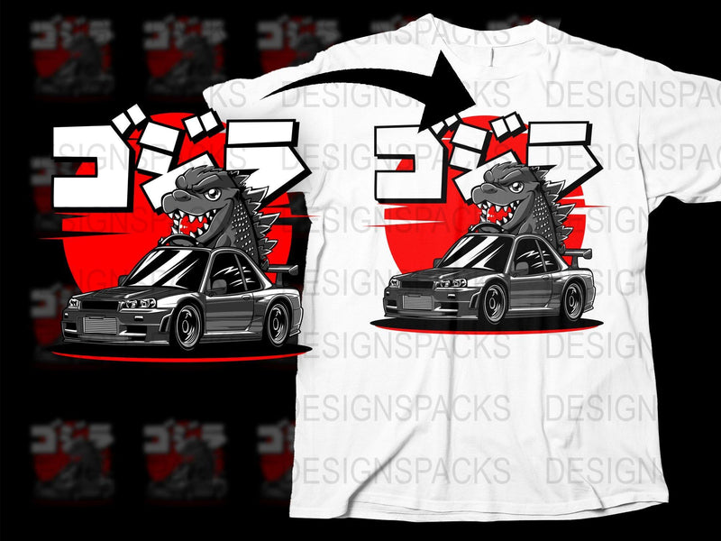 Embrace the ultimate fusion of monstrous power and speed with our Godzilla car graphic adorned on a vibrant unisex Png Digital Download perfect for car enthusiasts.