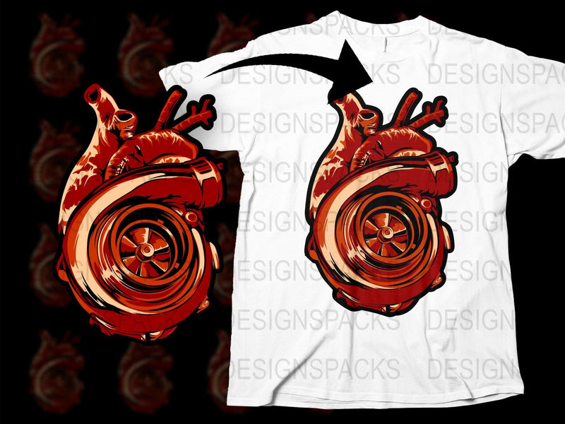 Show off your love for speed and engineering with this unique turbocharged heart graphic design. Perfect for car enthusiasts and lovers of originality.