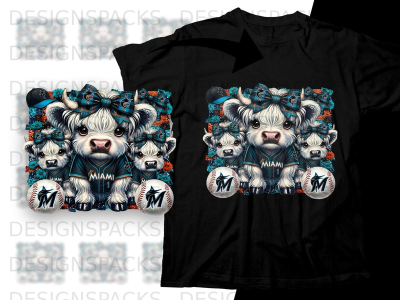 Elevate your game day aesthetic with our exclusive T-Shirt, a perfect blend of spirited fandom and irresistible charm. This design features a heartwarming trio of fluffy highland cows, impeccably styled in their Miami Marlins gear, ready to cheer on the team with you. It's the ultimate way to showcase your devotion with a unique, whimsical touch.
