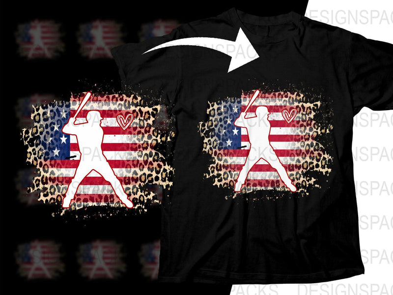 Show your love for baseball with this stylish T-shirt featuring a baseball player silhouette against an American flag design with leopard print elements.