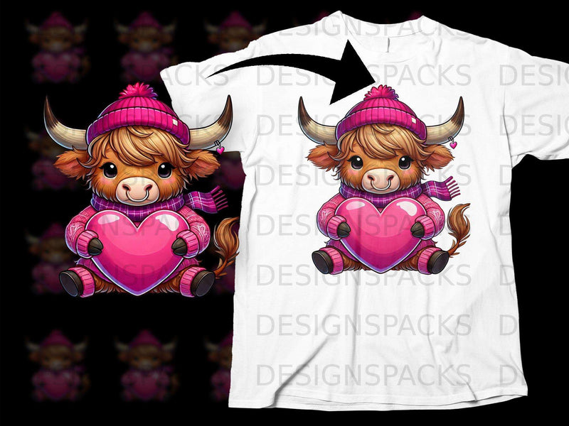 Cute Highland Cow Holding Heart for Valentine's Day Png Digital Download