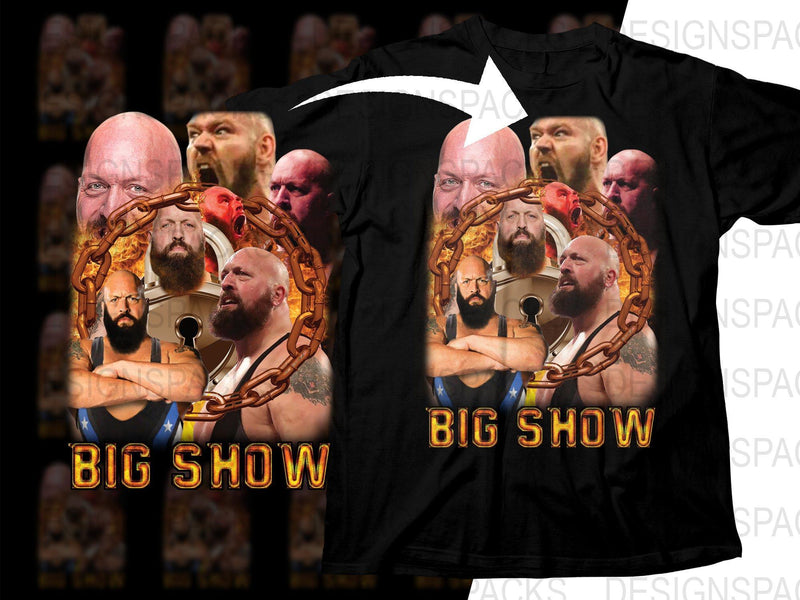 Celebrate the legacy of Big Show with this dynamic wrestling fan T-Shirt featuring a bold collage with intense expressions and iconic imagery.
