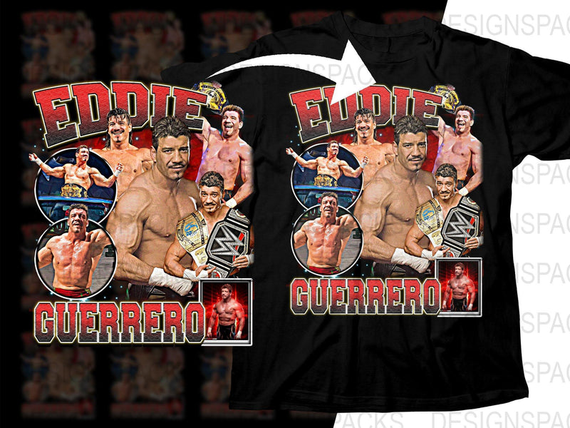 Celebrate the legacy of Eddie Guerrero with this vibrant and detailed graphic T-shirt featuring iconic wrestling moments and championship belts.