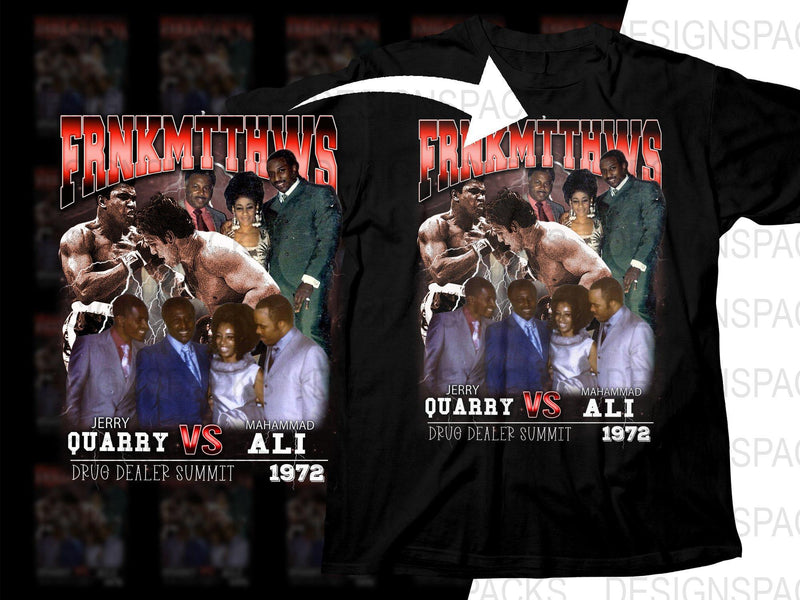 Relive the iconic 1972 match between Jerry Quarry and Muhammad Ali with this exclusive T-shirt design showcasing the legendary fighters.