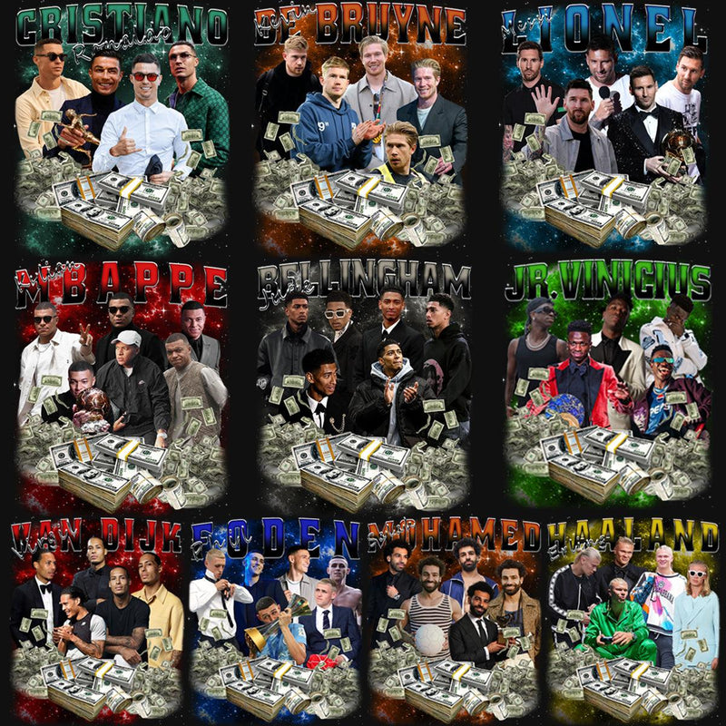 Stand out in the competitive t-shirt market with our "10 Street Wear Football Soccer Players Bootleg Money Designs Bundle." Perfect for making a statement, these designs will undoubtedly attract attention and appeal to your customers, driving more sales and growing your business. Download your bundle today and start creating apparel that speaks volumes!